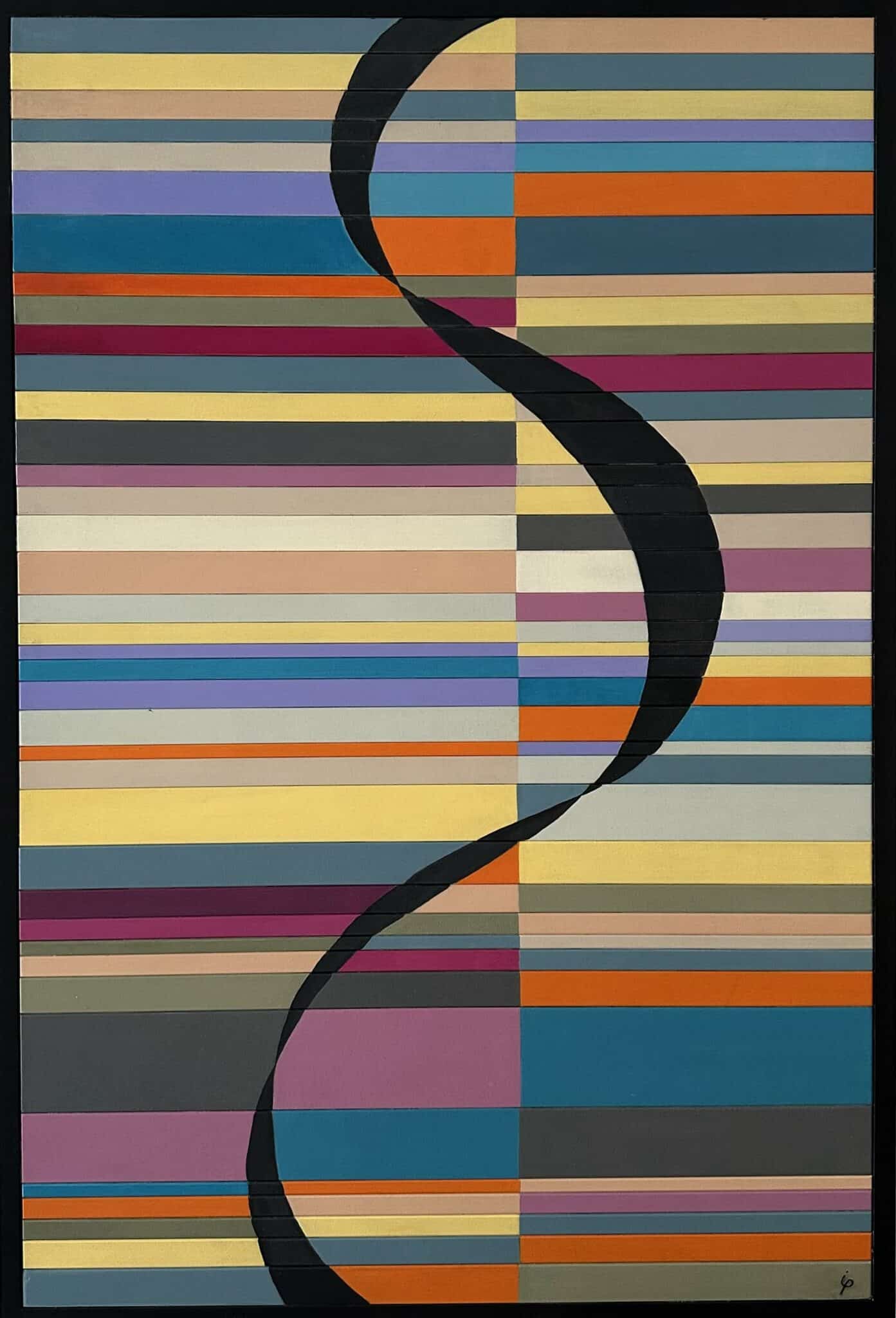 Entièrement réalisé à la main dans notre atelier de Marly-le-Roi, il se compose de bandes horizontales multicolores traversées par une ligne sinueuse noire, créant un mouvement fluide qui contraste avec la rigueur des alignements.