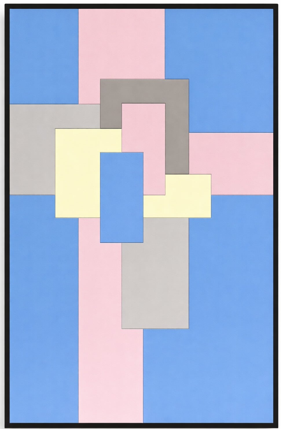 Cette œuvre au format 90 × 60 cm associe une composition géométrique structurée à une palette pastel douce et harmonieuse. Bleu tendre, rose quartz, gris perle et jaune clair s’imbriquent dans une construction simple et épurée.