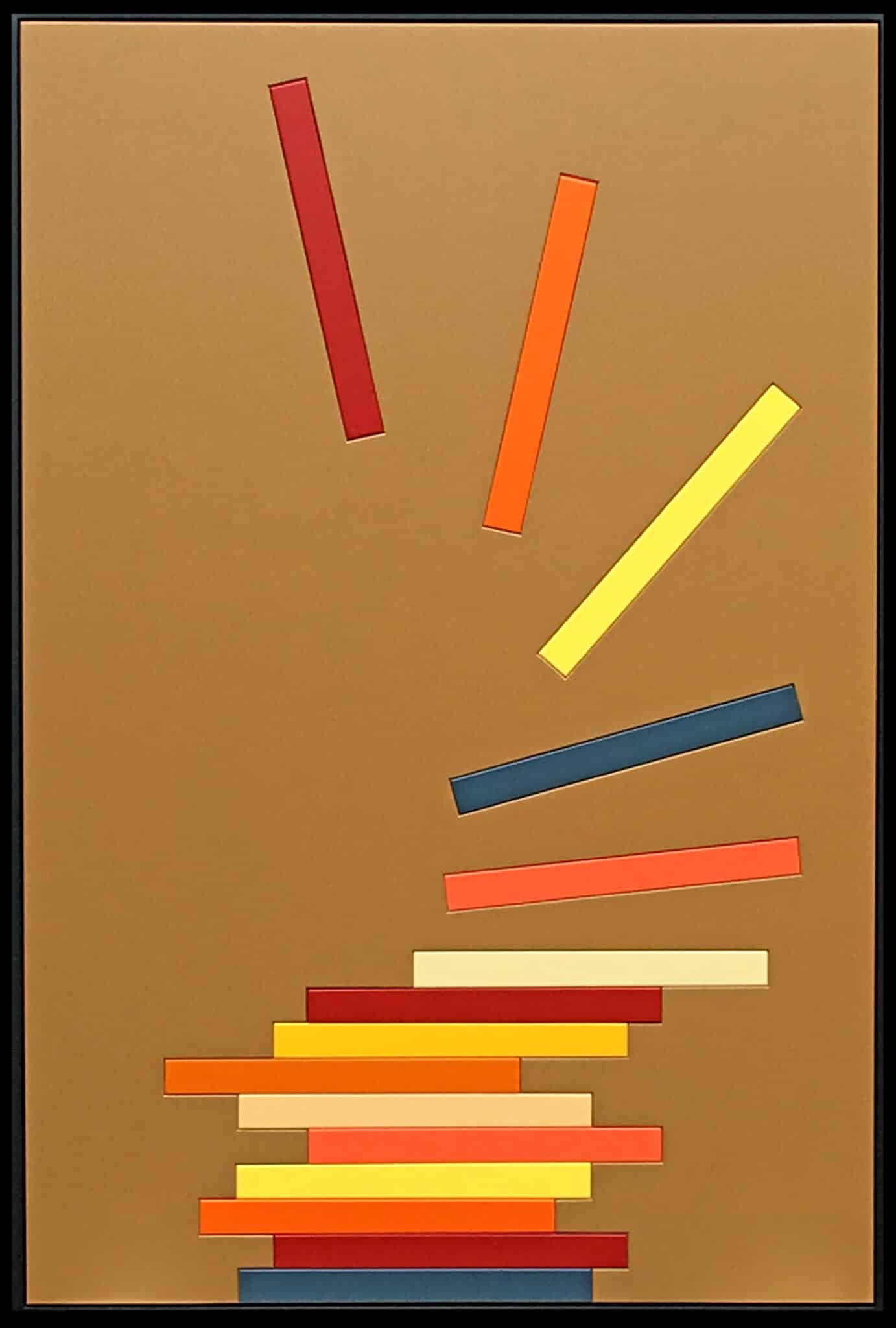 Cette œuvre de 90×60 cm joue avec les couleurs chaudes et les formes verticales pour rappeler la silhouette d’une pile de livres, symbole de savoir, de transmission et de curiosité.