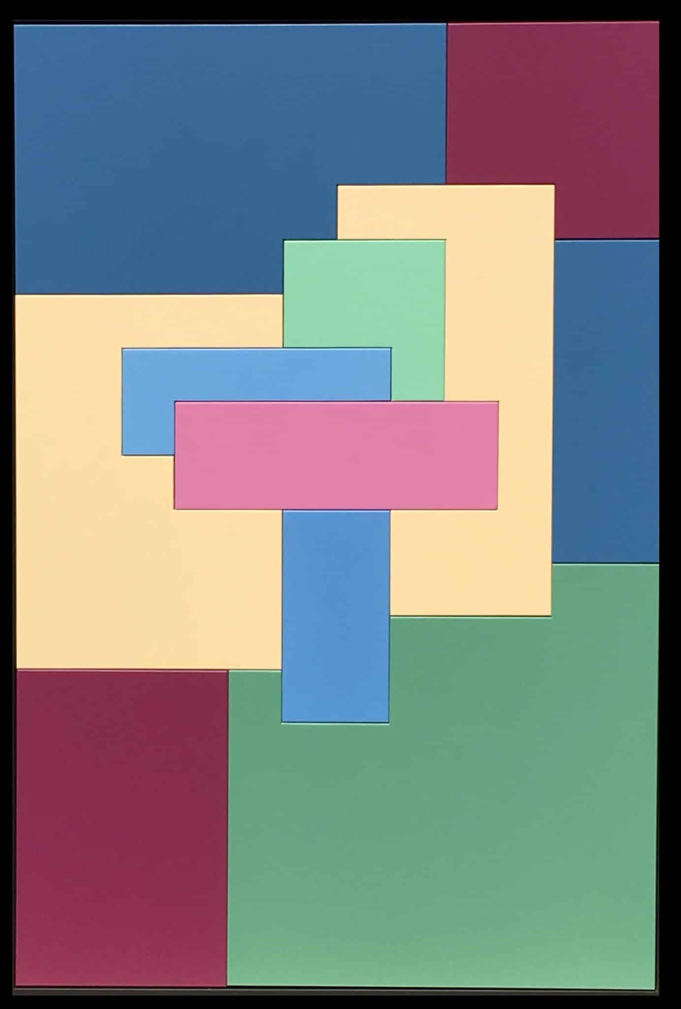 Les nuances bordeaux profond, vertes et bleu se mêlent à des tons plus doux comme le rose, le beige et le jaune claire créant une composition équilibrée à la fois moderne et apaisante. Chaque forme s’inscrit comme un fragment du temps qui passe, s’emboîtant les uns dans les autres pour donner une sensation d’ordre, de structure et de fluidité.