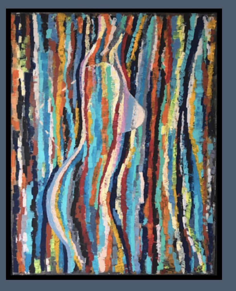 Cette œuvre s’inspire de l’idée de l’empreinte, de ce que l’on laisse derrière soi, volontairement ou non. Les traces abstraites laissent émerger la silhouette douce et ondulée d’une femme.