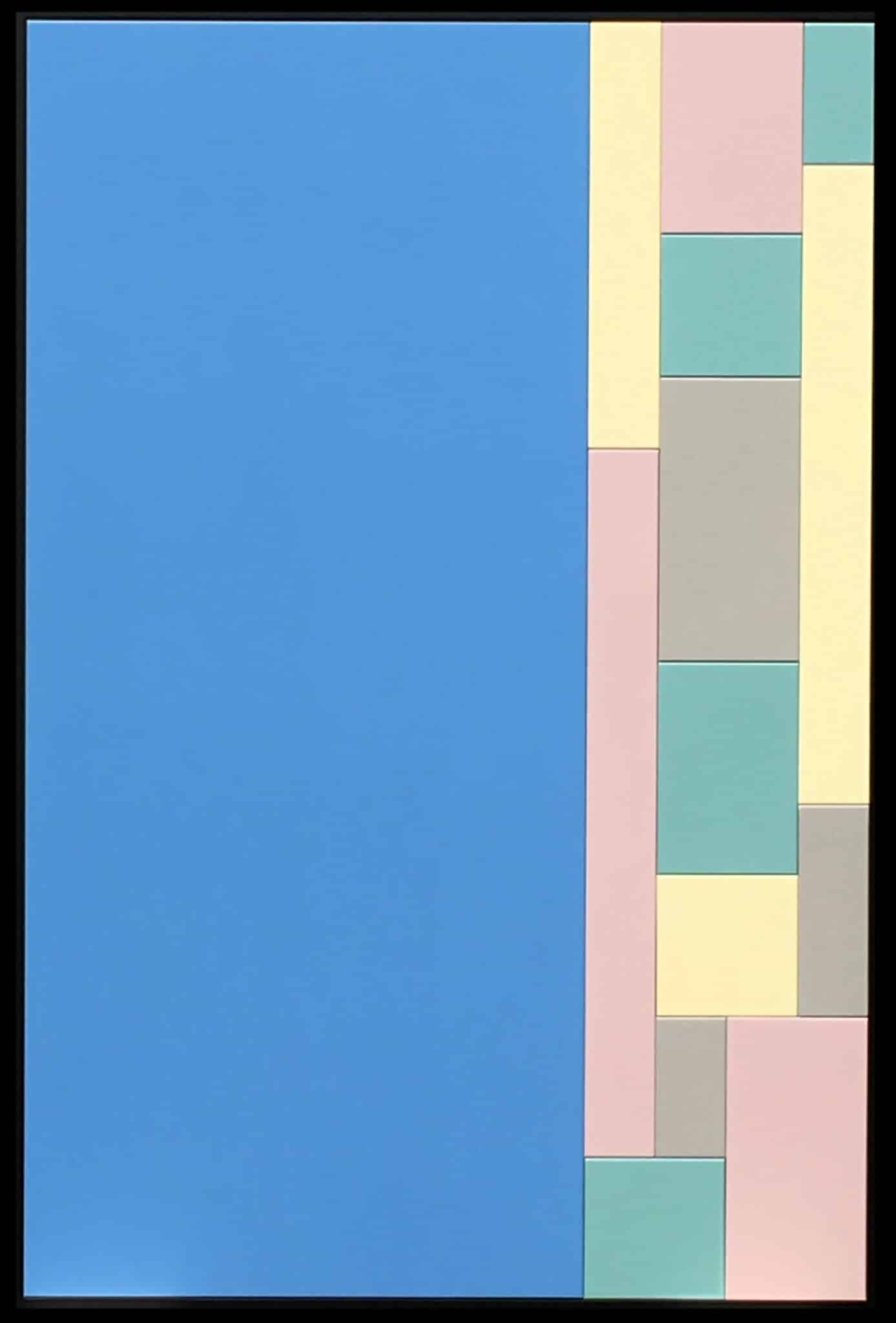 Les aplats laqués, nets et lumineux, captent subtilement la lumière. Cette œuvre joue sur la juxtaposition des couleurs, créant une dynamique visuelle qui évoque à la fois la rigueur architecturale et la liberté des compositions modernistes.