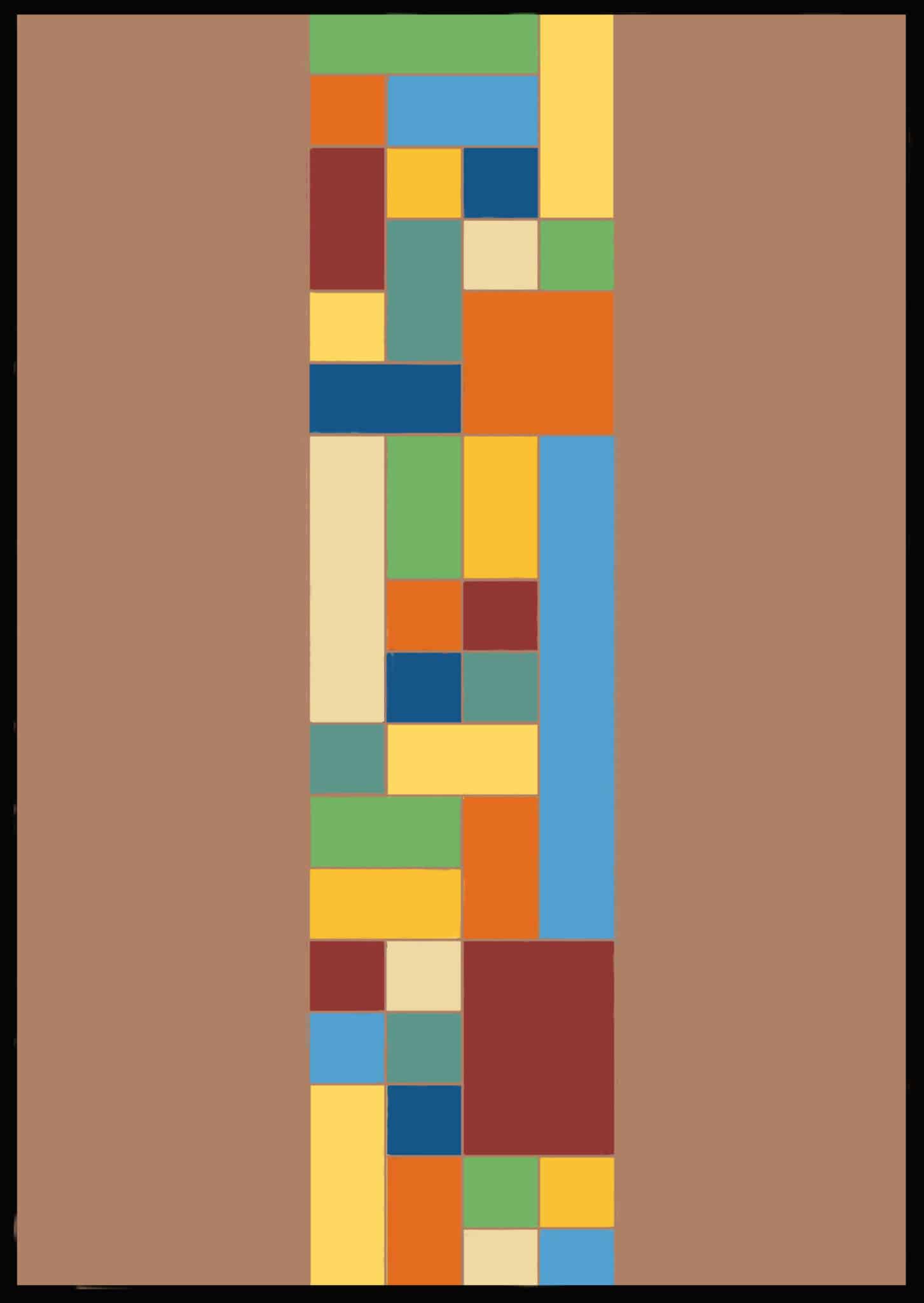 Le fond, d’un vert intense et profond, crée une base vibrante qui met en valeur l’ensemble des formes rectangulaires réparties autour. Ces rectangles, aux teintes variées — bleu, rouge, jaune, mais aussi des nuances intermédiaires — s’imbriquent comme les fragments d’une mosaïque contemporaine.