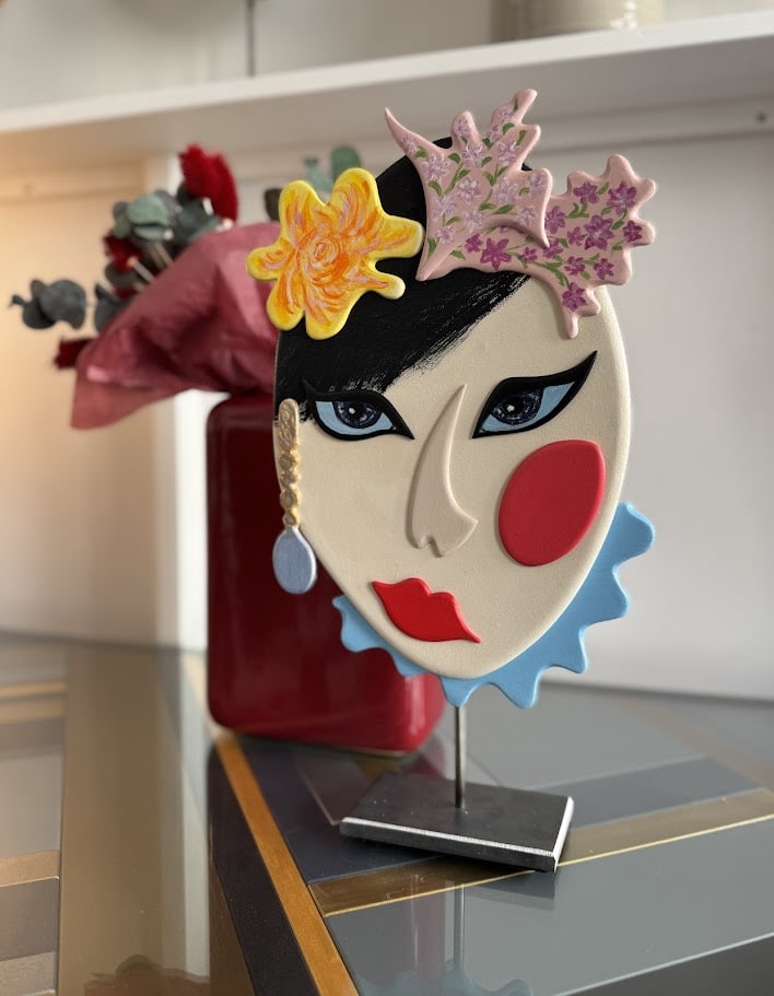 Avec ses dimensions de 20 × 35 cm, cette pièce s’intègre facilement dans un intérieur tout en affirmant une présence artistique forte. Le visage stylisé est construit par une composition de formes épurées et de volumes en relief, dans lesquels chaque élément est pensé comme une pièce graphique. Les fleurs, les lignes du regard et les aplats colorés s’organisent avec précision, créant un équilibre entre figuration et abstraction.