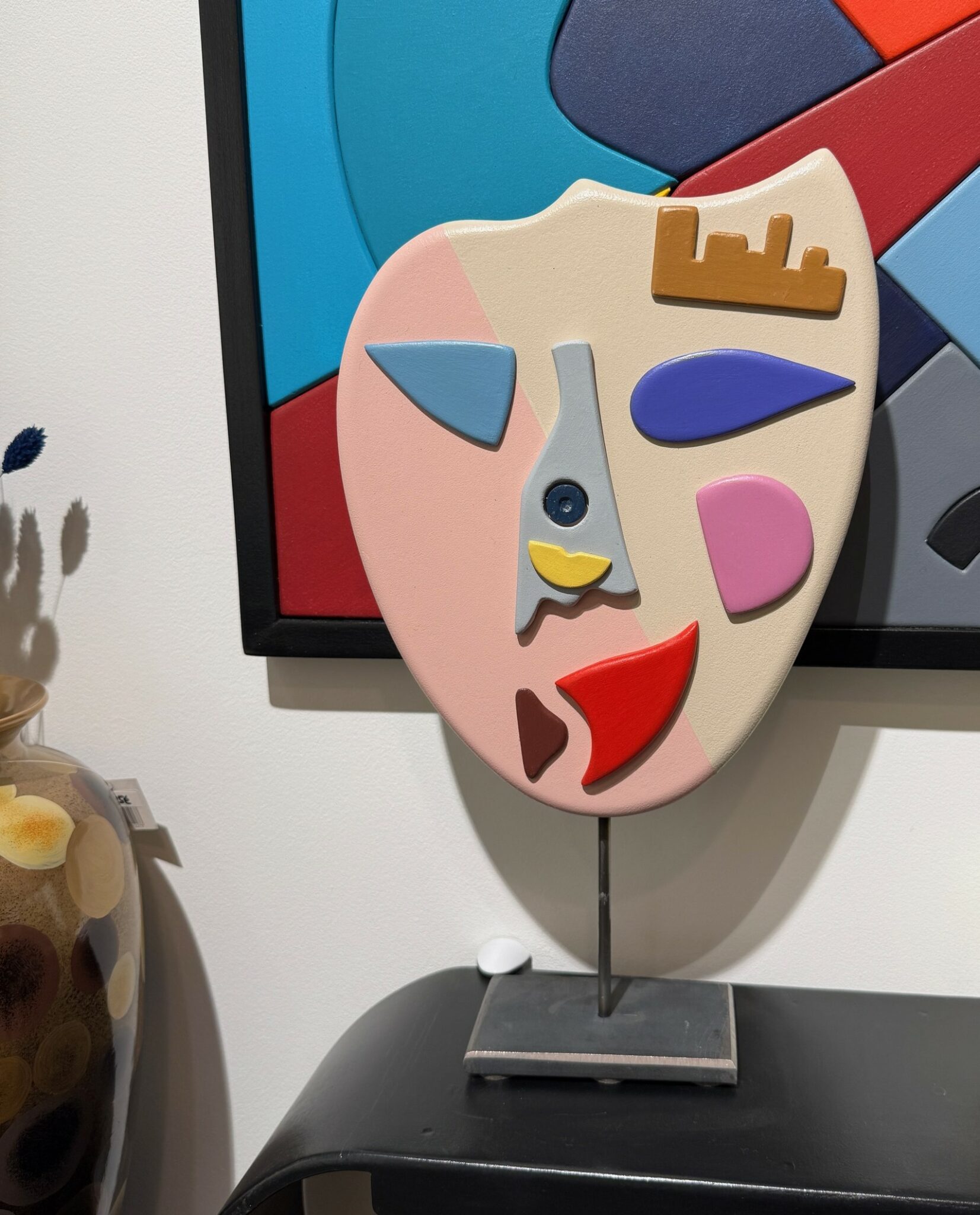 La palette colorée — mêlant bleu claire, bleu profond, rose poudré, rouge vibrant, jaune et beige — apporte dynamisme et singularité à l’ensemble. Le regard, marqué par deux yeux bleu claire et violet, devient le point focal de la sculpture, lui conférant une présence à la fois douce et affirmée.