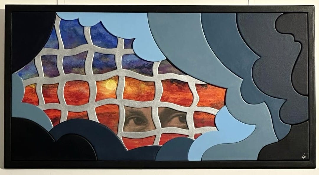 À travers cette trame, un paysage vibrant composé de rouges, orangés et violets évoque un horizon brûlant, un coucher de soleil ou un monde imaginaire. Au centre, un regard célèbre intégré en collage capte immédiatement l’attention : il suggère une présence, un dialogue silencieux, une envie d’ailleurs.